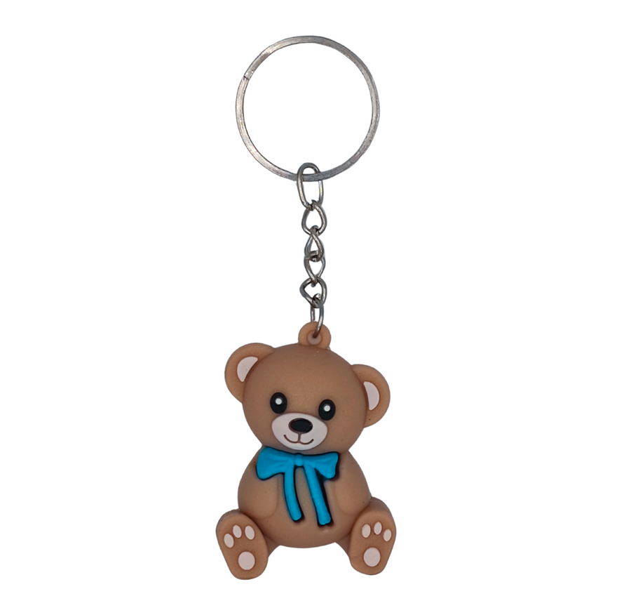 - Silikonowy brelok w kształcie brązowego misia z uroczą niebieską kokardą.