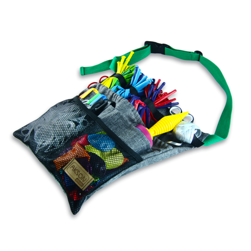 - pasa na balony - specjalne rzepy ułatwią przechowywanie długich balonów, dzięki nim można posegregować balony do modelowania i mieć do nich wygodny dostęp, kieszonki wykończone gumką dają możliwość przechowywania dodatkowych akcesoriów i okrągłych balonów, głębsze kieszenie idealnie sprawdzą się np. na pompkę do balonów, dodatkowo pas wypełniony balonami bardzo dobrze się prezentuje i przyciąga uwagę