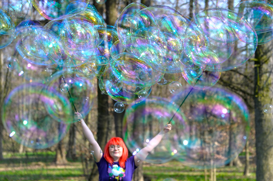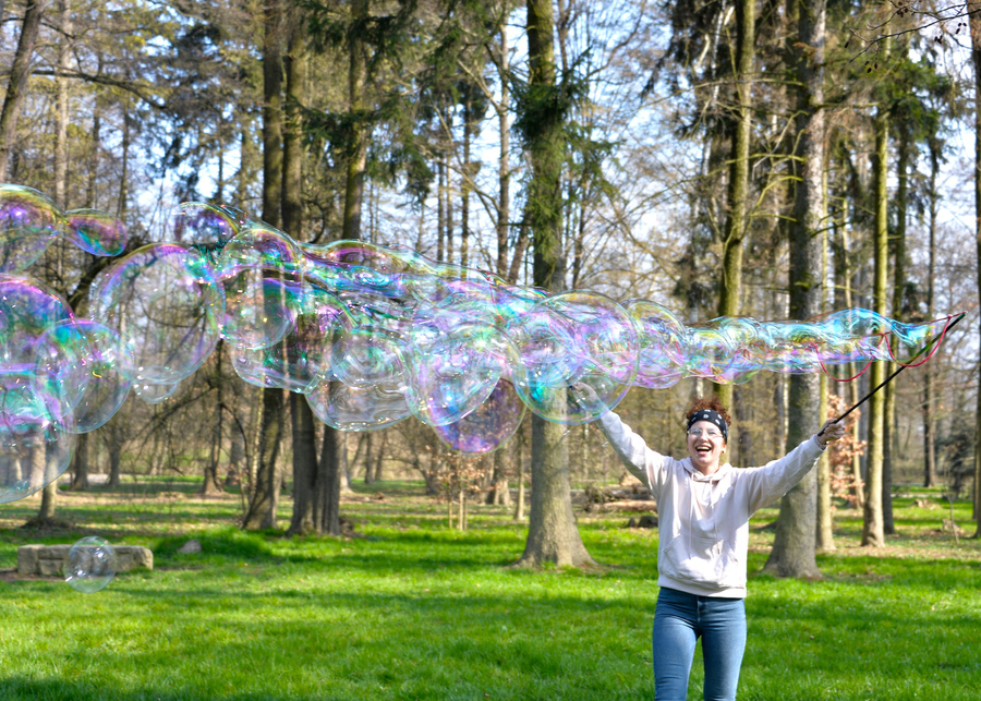 Zanurz sznurki w płynie, unieś kijki, rozłóż i zobacz, jak tworzą się piękne, ogromne bańki!