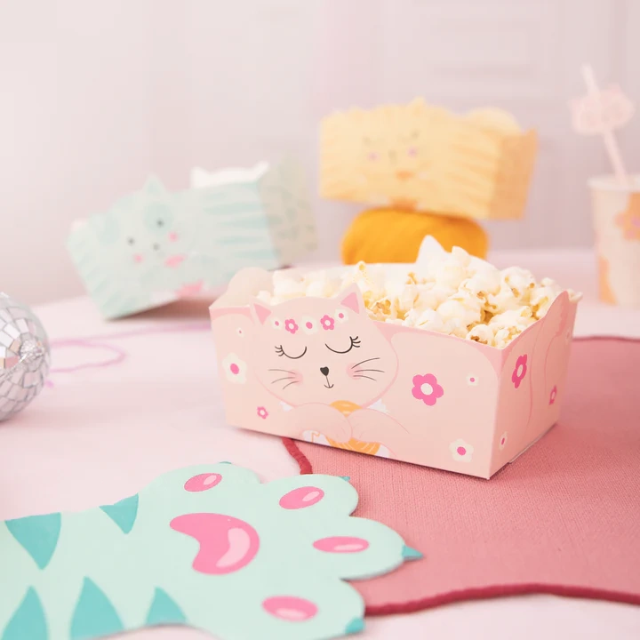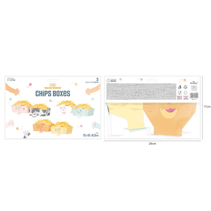 - Praktyczne, kartonowe pudełka na chipsy lub inne przekąski, ozdobione buźkami kotków.