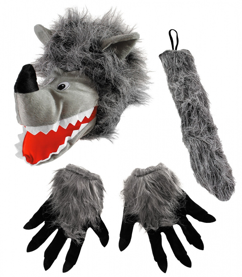 Przebranie wilka, składające się z czapki ze zwierzęcą paszczą i łapami. Wykonany z wytrzymałego, miłego w dotyku materiału. Bardzo wygodny, nie uciska, oddycha.