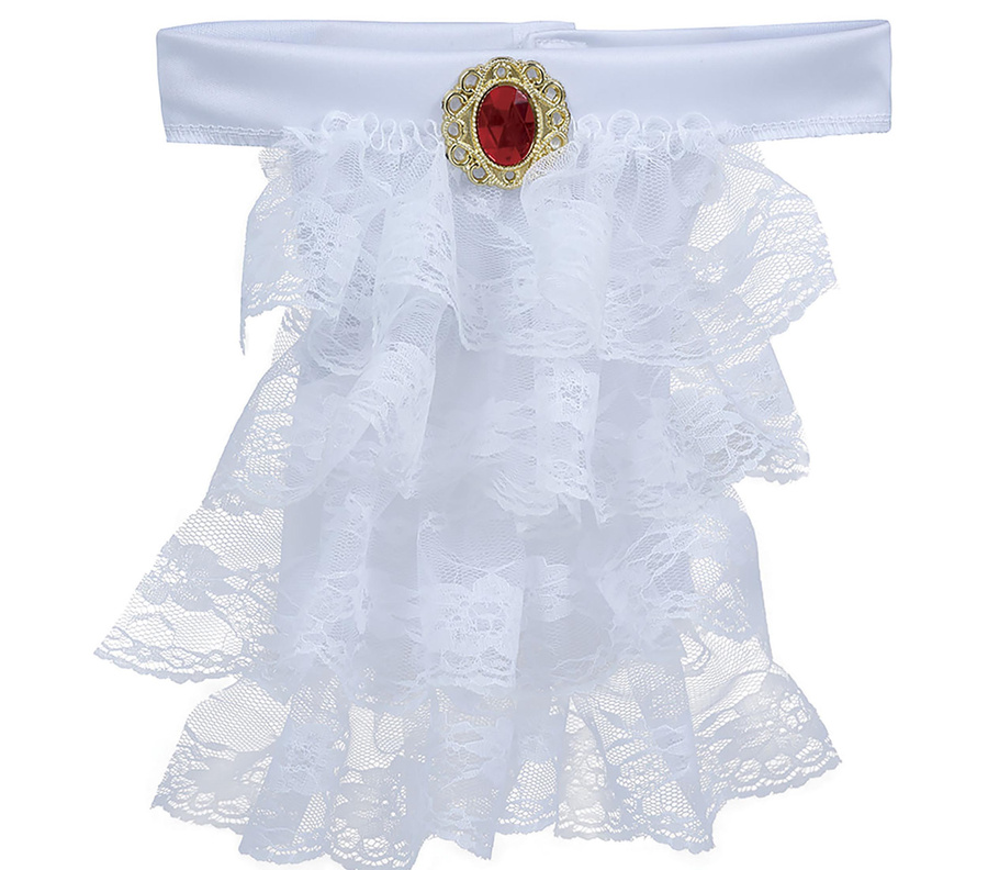Elegancki, biały żabot z dekoracyjną broszką to klasyczny dodatek, który doda Twojej stylizacji szlachetnego, gotyckiego charakteru. Wykonany z delikatnej koronki i ozdobiony efektowną broszką z czerwoną „kamienną” aplikacją w złotej oprawie, świetnie sprawdzi się jako uzupełnienie stroju wampira, arystokraty lub postaci z epoki.