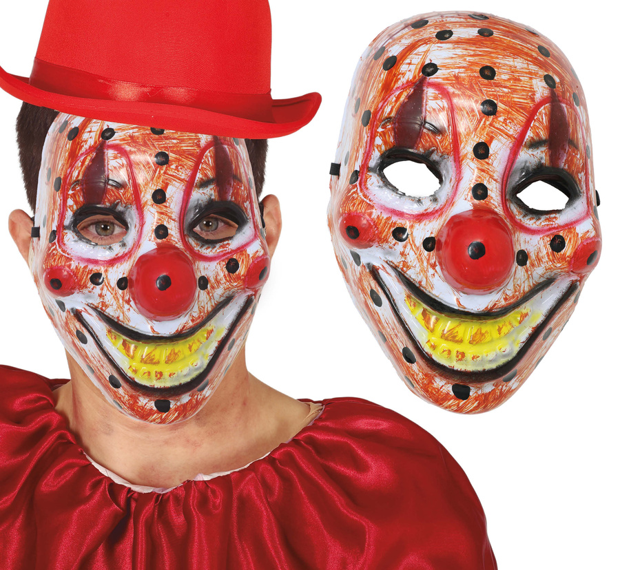 Przerażający klaun gotowy na Twoją imprezę halloweenową! Maska wykonana z tworzywa PVC przedstawia mroczną, groteskową twarz klauna z szerokim, złowieszczym uśmiechem, czerwonym nosem i kolorowym makijażem. Realistyczne detale i intensywne barwy sprawiają, że to idealny wybór na strój, który nie pozostanie niezauważony.