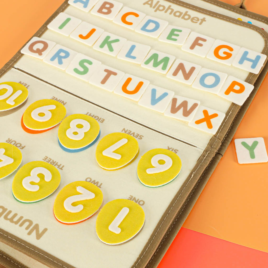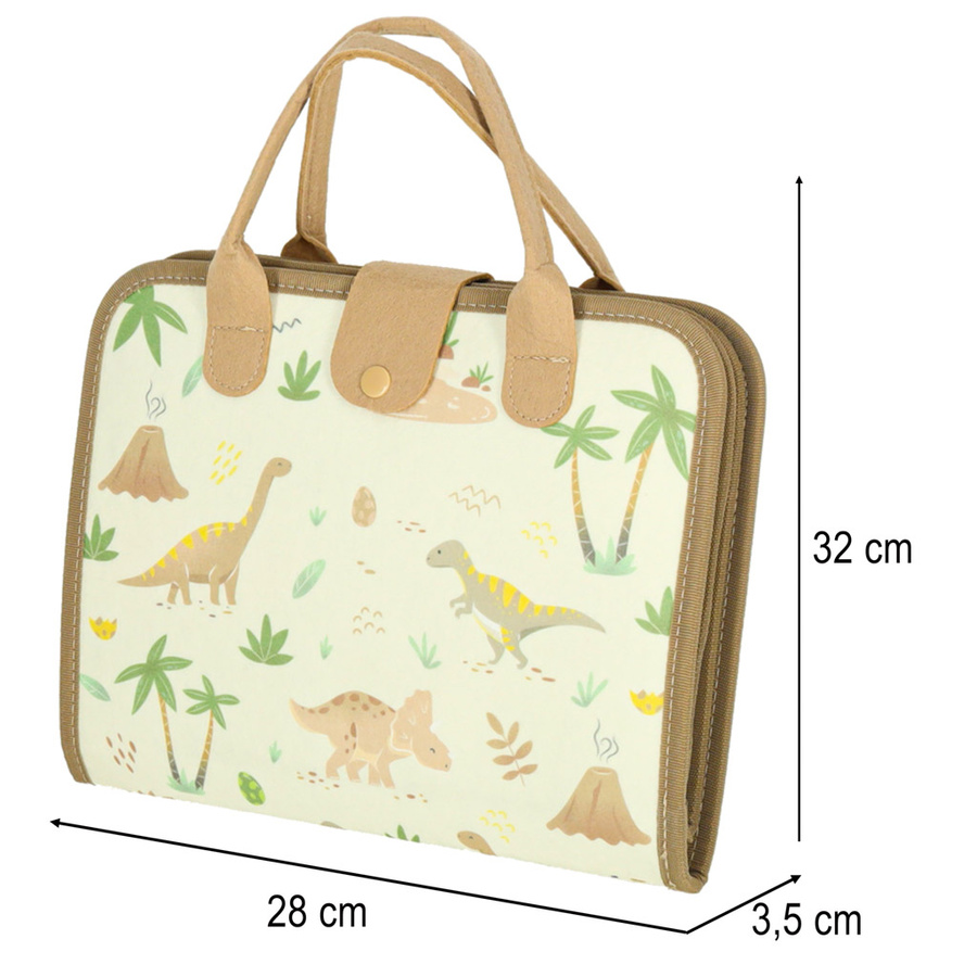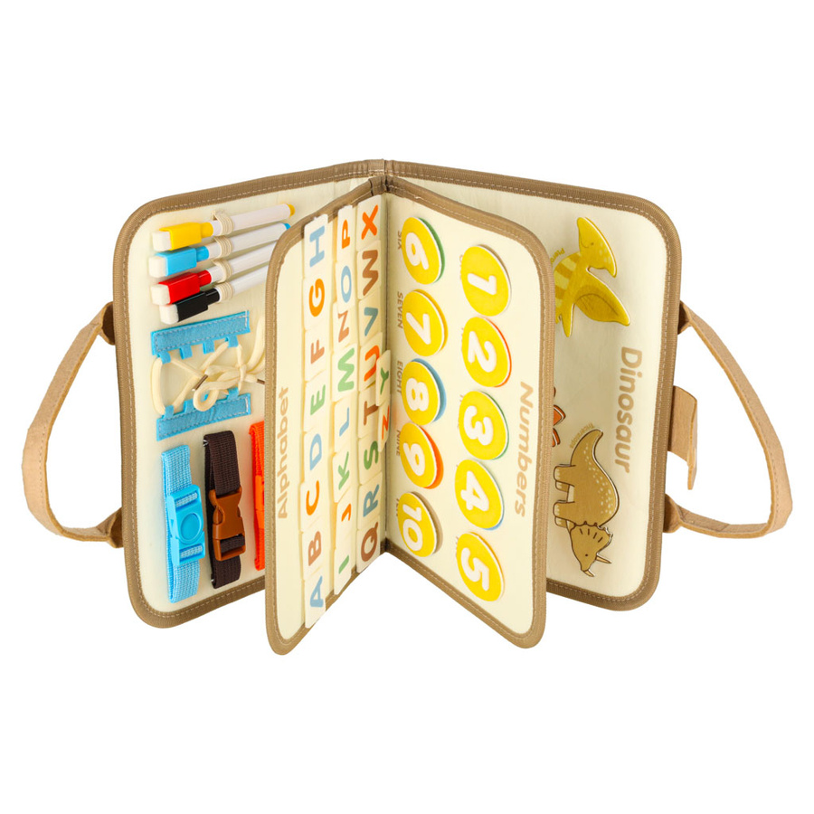 - Tablica manipulacyjna Montessori w formie teczki (filc, 28×22×3,5 cm, po rozłożeniu 45 cm), z elementami motorycznymi (zamki, guziki, klamry), edukacyjnymi (litery, cyfry, dinozaury) i kreatywnymi (tablica suchościeralna, 4 markery). Dla dzieci 3+.