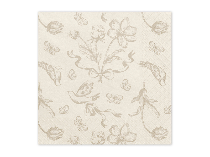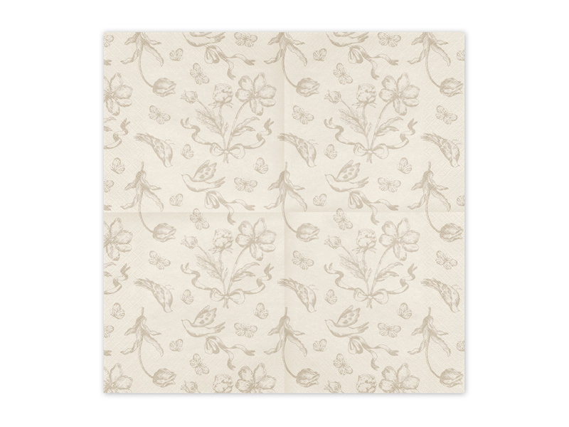 • Papierowe serwetki w kolorze beżowym z delikatnym kwiatowym wzorem.