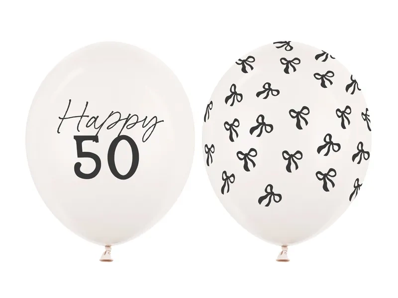 Świętuj 50. urodziny w wyjątkowym stylu! Ten elegancki balon lateksowy w delikatnym odcieniu pastelowej bieli (off-white) to idealny dodatek do dekoracji urodzinowej. Balon ma rozmiar 12 cali (ok. 30 cm) i ozdobiony jest czarnym nadrukiem: w stylowe kokardki lub napis "Happy 50".