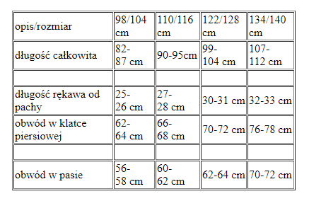 opis/rozmiar | 98/104 cm | 110/116 cm | 122/128 cm | 134/140 cm |