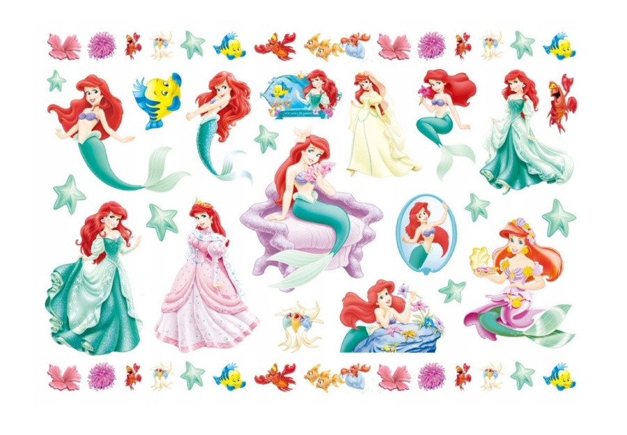 Zestaw tatuaży dla dzieci przedstawiający różne postacie z popularnej bajki "Mała Syrenka". Na obrazku znajdują się różne wersje Arielki w różnych pozach i strojach, a także inne postacie z bajki, takie jak Florek i Sebastian