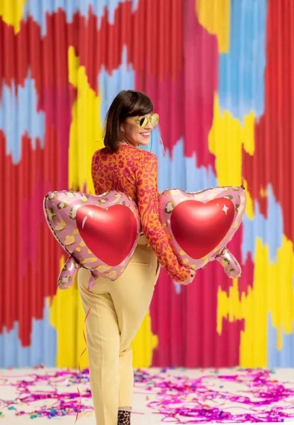 - Świetna zabawa dla fotografii: Balon w kształcie okularów serc stanowi także doskonałą dekorację do sesji fotograficznych czy fotobudek.
