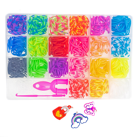 Zestaw gumek do bransoletek z narzędziami zawiera specjalne, małe gumki w 21 różnych wzorach (jednolitych kolorach lub w kolorowy miks), narzędzie do zaplatania bransoletek, haczyki do ich zamykania i trzy ozdobne przywieszki.