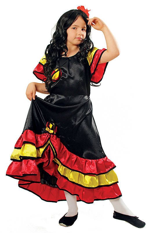 - Strój Hiszpanka składa się z: sukienki z kolorowymi falbanami. Materiały: atłas. Dostępne rozmiary: 110/116, 122/128, 134/140.