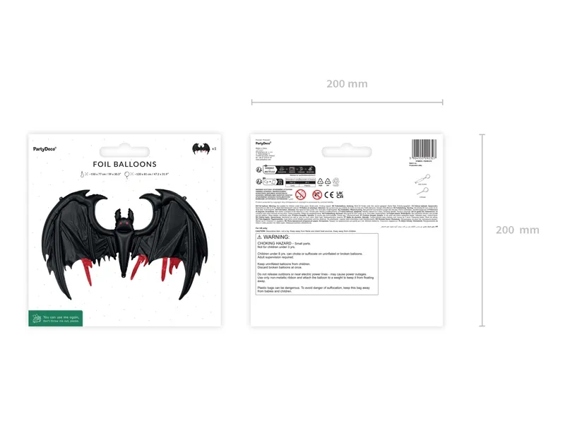 - Balon foliowy Nietoperz w kolorze czarnym z czerwonymi akcentami. Wymiary przed napompowaniem ok. 150 x 77 cm wymiary po napompowaniu ok. 120 x 81 cm .