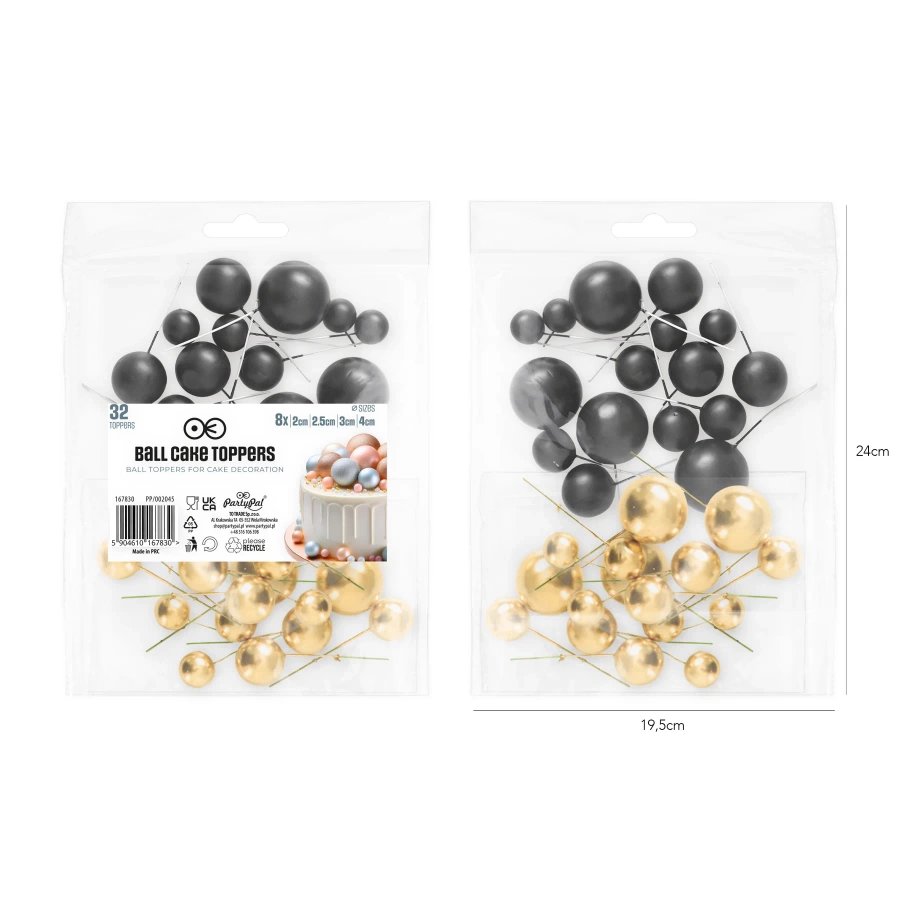 Pikkery Toppery na tort kulki czarne złote szare i kremowe 32 szt.