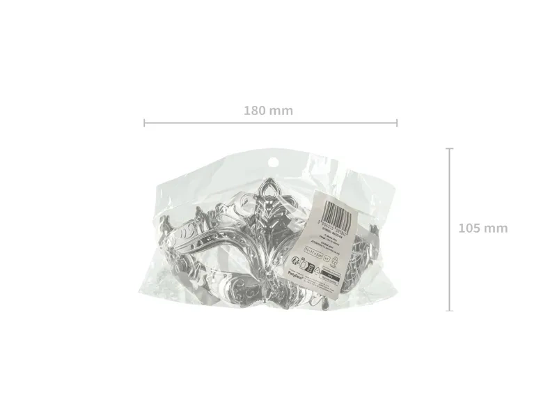 Maska karnawałowa na oczy wykonana z tworzywa sztucznego w kolorze srebrnym. Maska wiązana jest z tyłu głowy za pomocą wstążki, dzięki czemu z łatwością dopasujesz ją do każdego rozmiaru głowy.