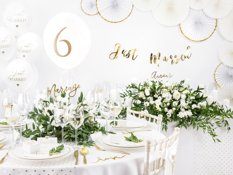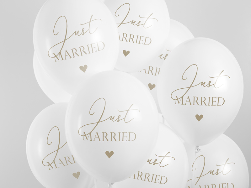 - Balon Strong, Pastel Pure White ze złotym, dwustronnym nadrukiem Just Married, średnica 30 cm. Cena za sztukę.