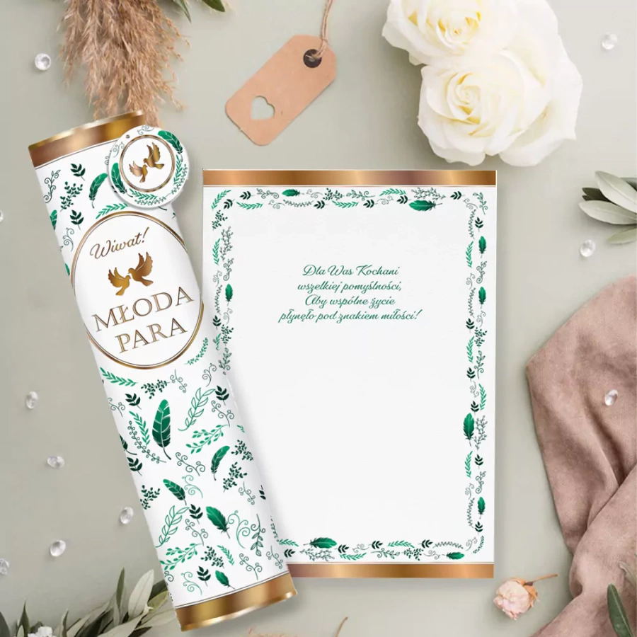 Elegancka kartka okolicznościowa w formie tuby to wyjątkowa pamiątka z okazji ślubu. Roślinny motyw w zielono złotym odcieniu oraz staranne wykonanie sprawiają, że doskonale nadaje się do wręczenia w dniu uroczystości jako dodatek do prezentu lub samodzielny upominek z życzeniami dla Młodej Pary.