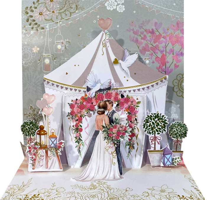 Wyjątkowa kartka urodzinowa, która po otwarciu zamienia się w przestrzenną dekorację przedstawiającą Parę Młodą na tle weselnego namiotu. To oryginalna alternatywa dla tradycyjnych kartek – pełna uroku, elegancka i niezapomniana.
