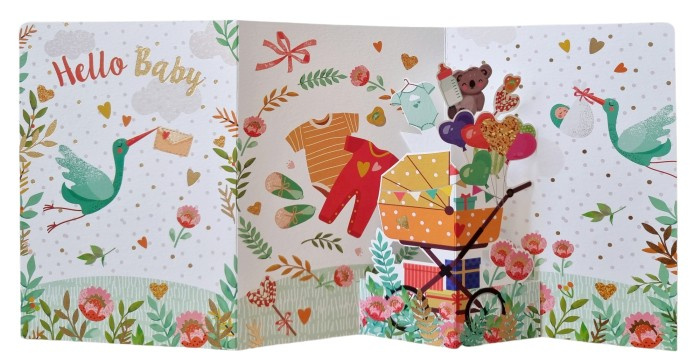Urocza kartka rozkładana w formie 3D. Po rozłożeniu kartki pojawia się przestrzenna dekoracja wózka, oraz kolorowa, wesoła grafika nawiązująca do ważnego i radosnego wydarzenia jakim są narodziny dziecka. To wyjątkowy i pełen ciepła sposób, by uczcić narodziny dziecka lub powitać nowego członka rodziny.