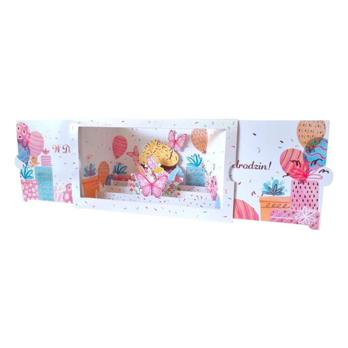 Wyjątkowa kartka w formie rozsuwanego „teatru”, która po otwarciu tworzy trójwymiarową, przestrzenną scenę. Kolorowe balony, prezenty i motyle sprawiają, że jest to oryginalny i elegancki sposób, aby przekazać urodzinowe życzenia w wyjątkowej oprawie.