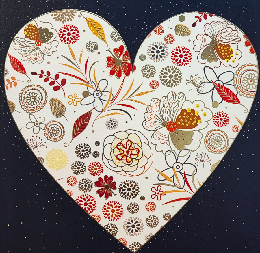 Elegancka kartka okolicznościowa wykonana z dwóch warstw papieru. Pierwsza zdobiona jest ażurowym wzorem kotków, a druga przedstawia kolorowy, kwiatowy nadruk w kształcie serca. Po złożeniu obie warstwy tworzą spójny, efektowny obraz.