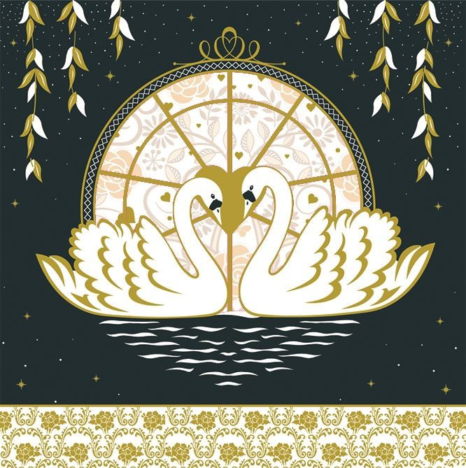 Elegancka kartka okolicznościowa wykonana z dwóch warstw papieru. Pierwsza zdobiona jest ażurowym wzorem łabędzi a druga przedstawia kwiatowy nadruk w kształcie serca. Po złożeniu obie warstwy tworzą spójny, efektowny obraz.