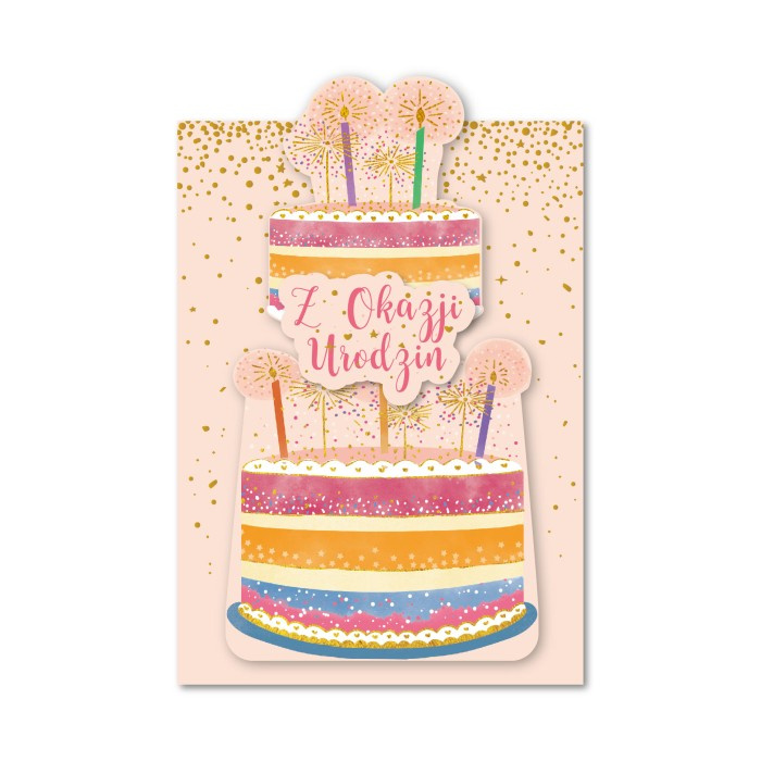 - Kartka urodzinowa Z okazji Urodzin, z kolorowym tortem, z wysuwanymi życzeniami. Cena za 1 szt.