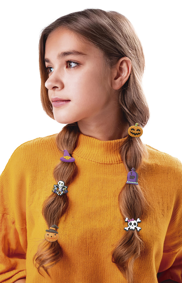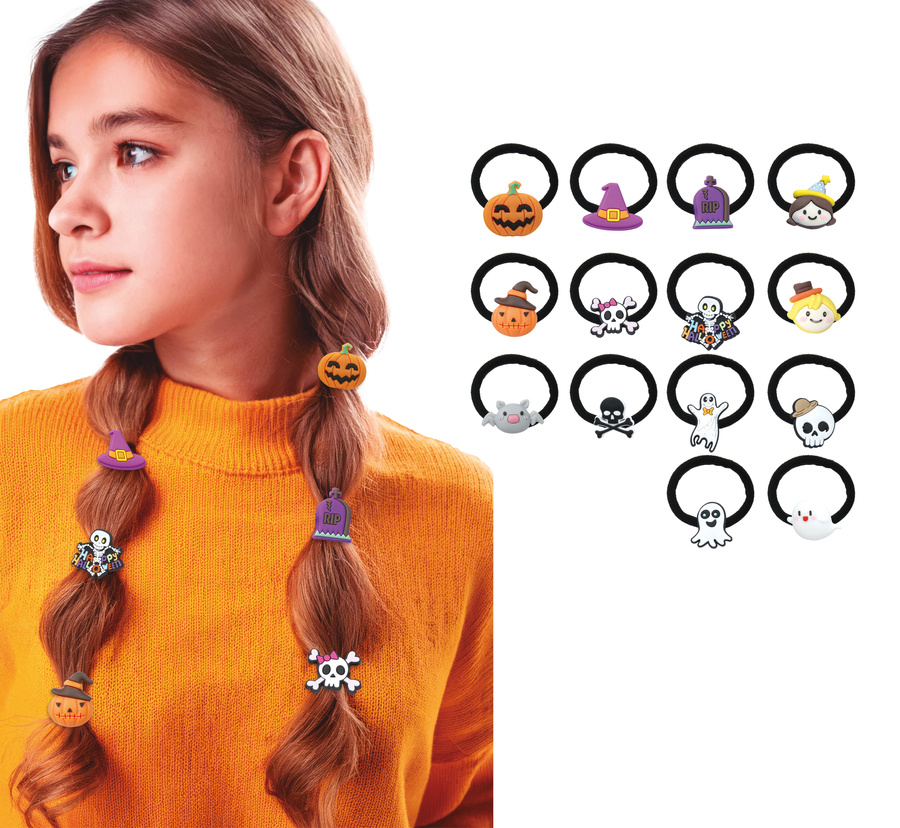 W zestawie znajduje się 14 frotek ozdobionych kolorowymi figurkami: duszki, dynie, czaszki i inne ozdoby w tematyce halloween. Każda ozdoba wykonana z miękkiego silikonu.