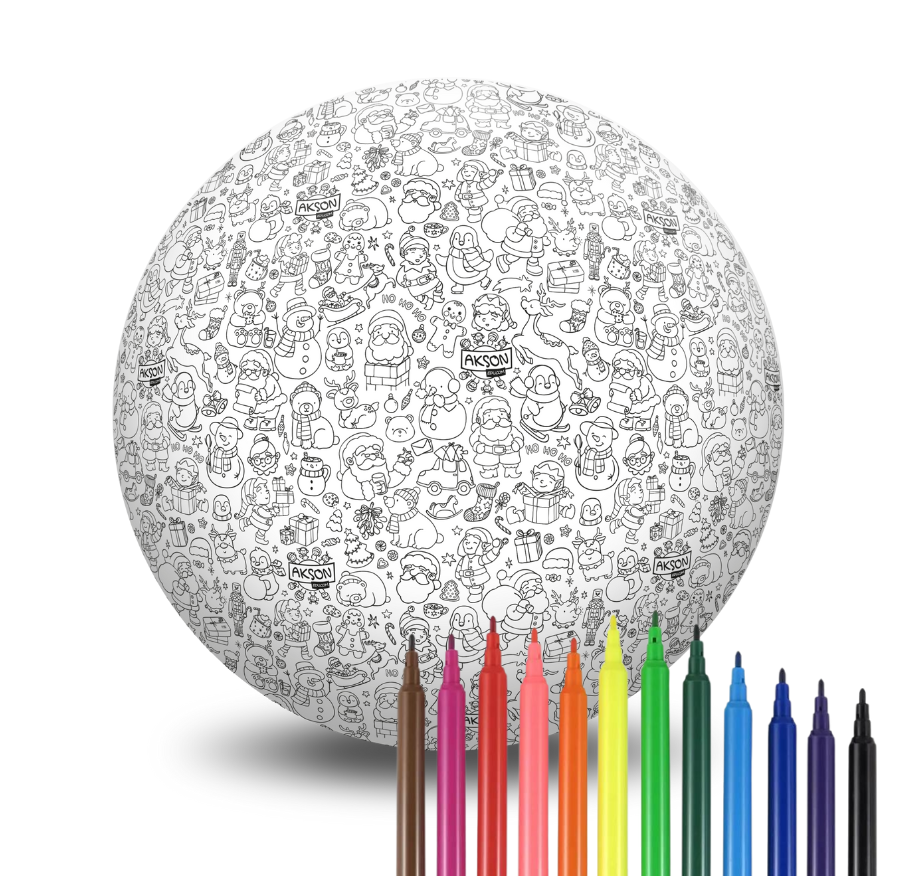 Piłka balonowa do kolorowania to wyjątkowa zabawka kreatywna, która łączy ruch z twórczą zabawą. W wersji świątecznej z grafiką związaną z Bożym Narodzeniem i zimą sprawdzi się jako świetny prezent pod choinkę i atrakcja dla dzieci w okresie bożonarodzeniowym. Wystarczy włożyć do środka balon, napompować go i założyć materiałowy pokrowiec z nadrukiem – gotowe! Pokrowiec można kolorować dowolnymi flamastrami czy kredkami do tkanin, a po zabawie łatwo go złożyć i schować.