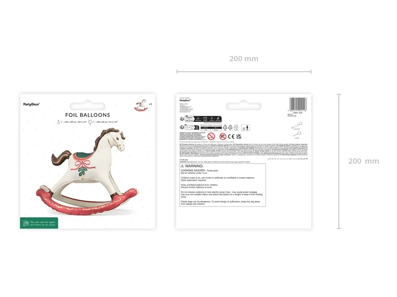 - Stojący balon foliowy Koń z motywem świątecznym, mix kolorów. Wymiary przed napompowaniem ok. 118 cm x 104 cm (46.5 x 41''), wymiary po napompowaniu ok. 106 x 86 cm (41.5 x 34''). Do napompowania powietrzem. Zestaw zawiera słomkę.