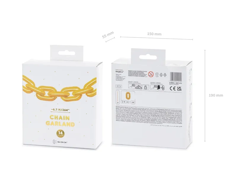 - Girlanda balonowa Łańcuch w kolorze złotym, wymiar jednego ogniwa ok. 86 cm (34''), wymiary napompowanej girlandy ok. 6,7 m.