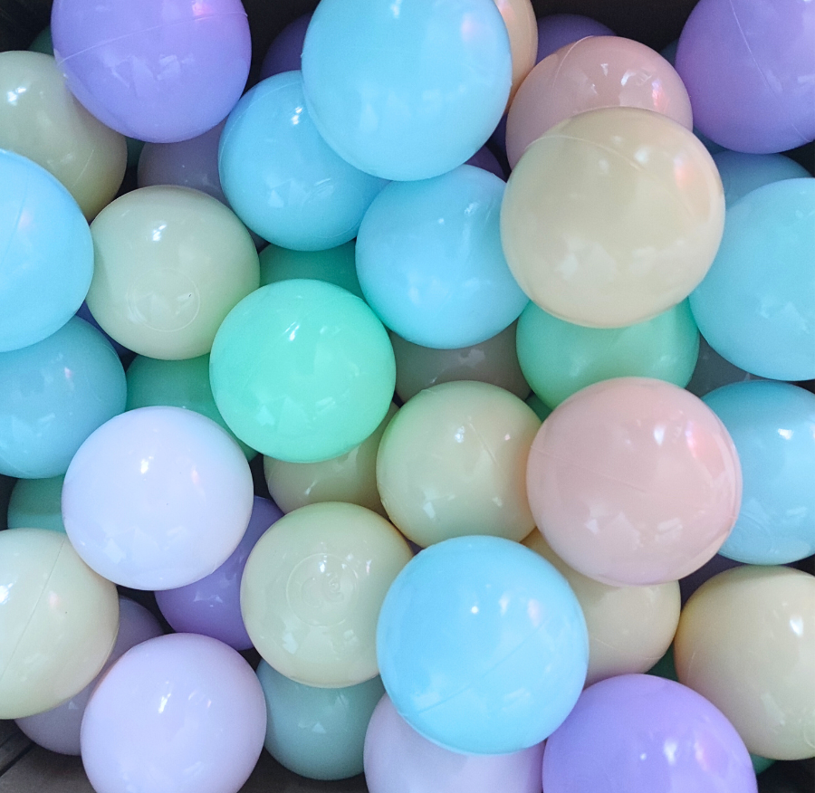 W zestawie znajdziecie piłeczki basenowe w pastelowych kolorach: żółty, różowy, łososiowy, błękitny, miętowy, fioletowy