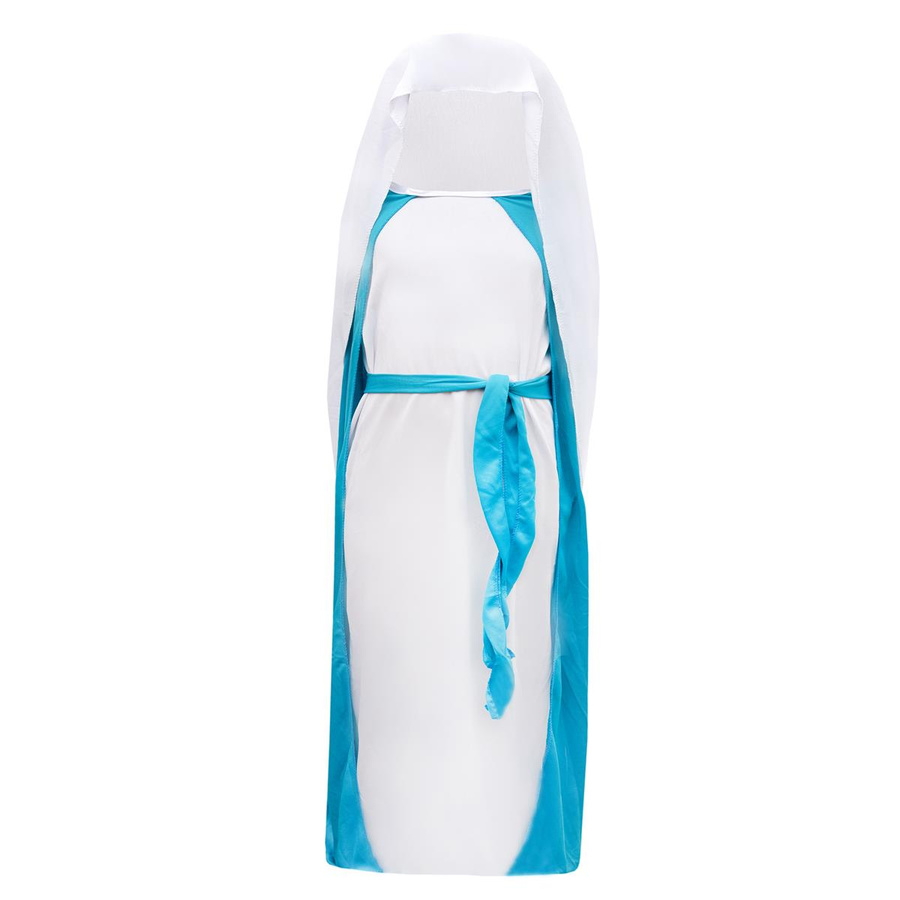 Kostium przedstawiający postać Maryi, idealny na jasełka, przedstawienia bożonarodzeniowe czy uroczystości szkolne i parafialne. Wykonany z lekkiego i wygodnego materiału, zapewnia komfort noszenia i autentyczny wygląd.