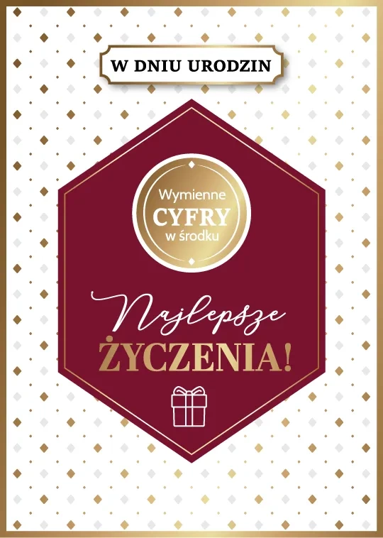 Elegancka, klasyczna kartka urodzinowa w odcieniach czerwieni i złota. Możliwość personalizacji wieku, dzięki naklejkom w kształcie cyfr, które umieszczasz na okładce. Cyfry od 0-9.