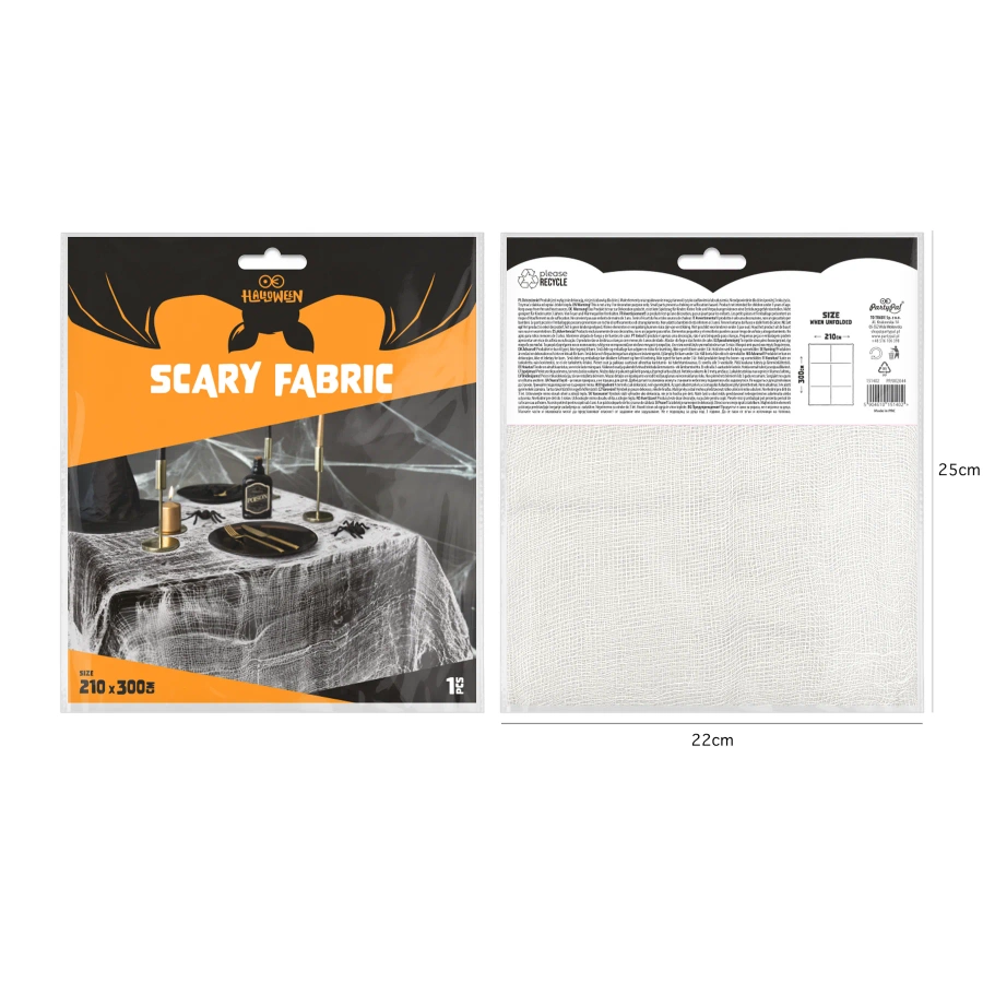 Efektowna biała tkanina imitująca poszarpany bandaż to idealna dekoracja stołu, sufity czy ściany, która odmieni każde przyjęcie. Sprawdzi się zarówno w domu, jak i na imprezach tematycznych.