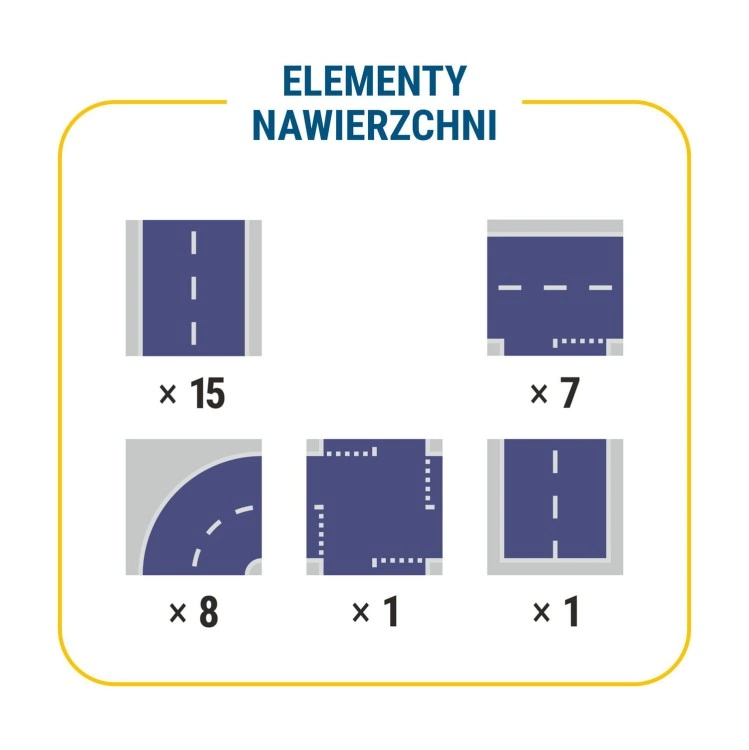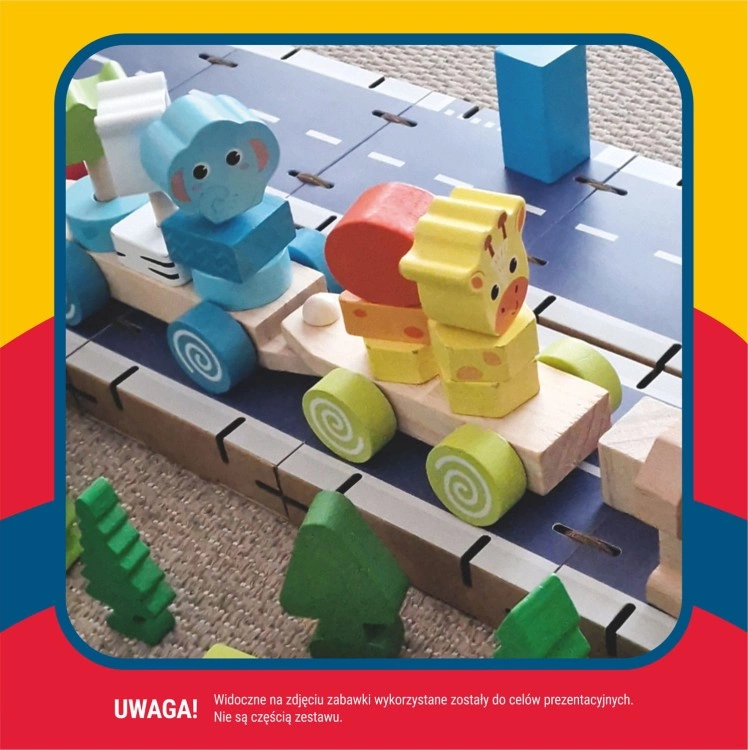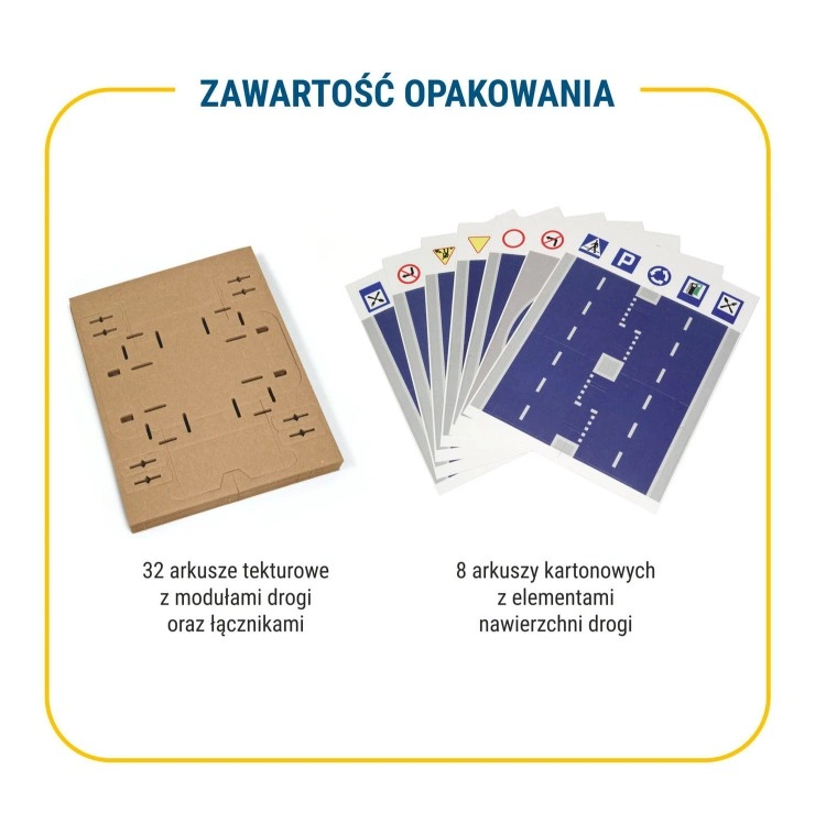 - Tekturowe klocki konstrukcyjne, 32 elementy do samodzielnego złożenia oraz 32 kolorowe elementy nawierzchni.