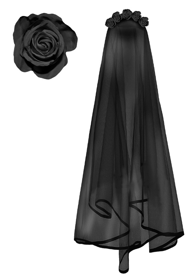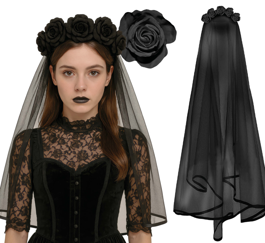 - Piękny czarny wianek z dużymi kwiatami i welonem. Całość przymocowana do opaski, która zapewnia wygodne i szybkie mocowanie na głowie