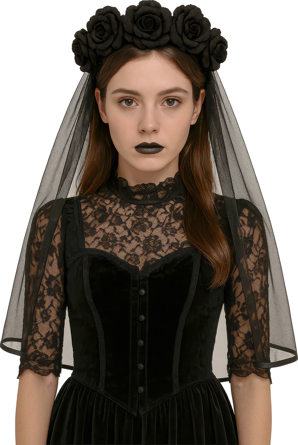 Elegancka i nieco mroczna opaska-wianek zdobiona czarnymi kwiatami z przyczepionym welonem — idealna jako dodatek do stylizacji gotyckich, ślubnych, halloweenowych lub do sesji fotograficznej.