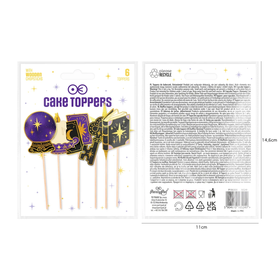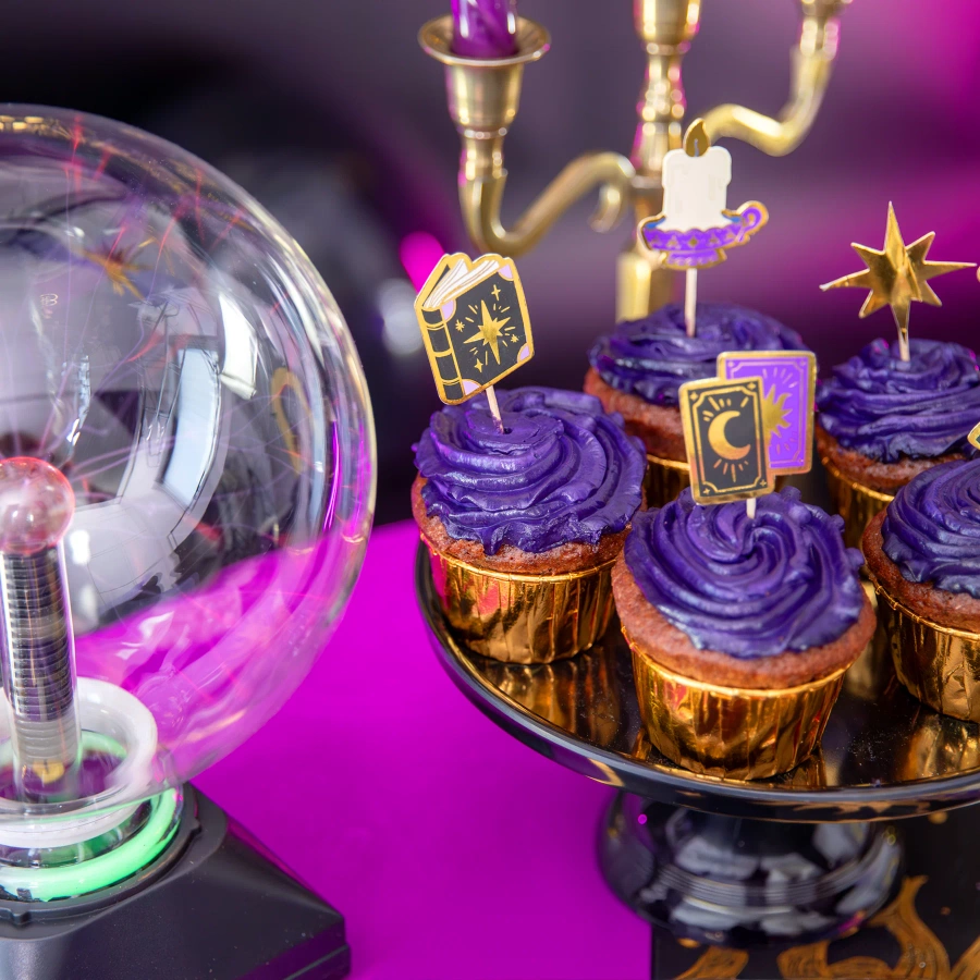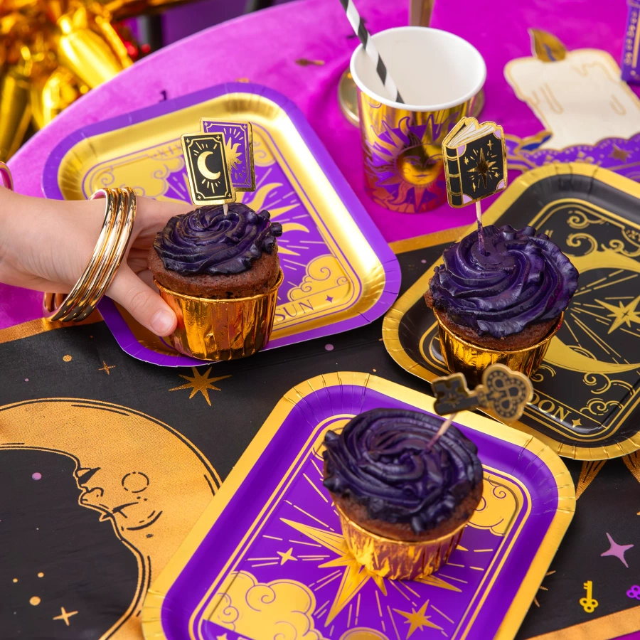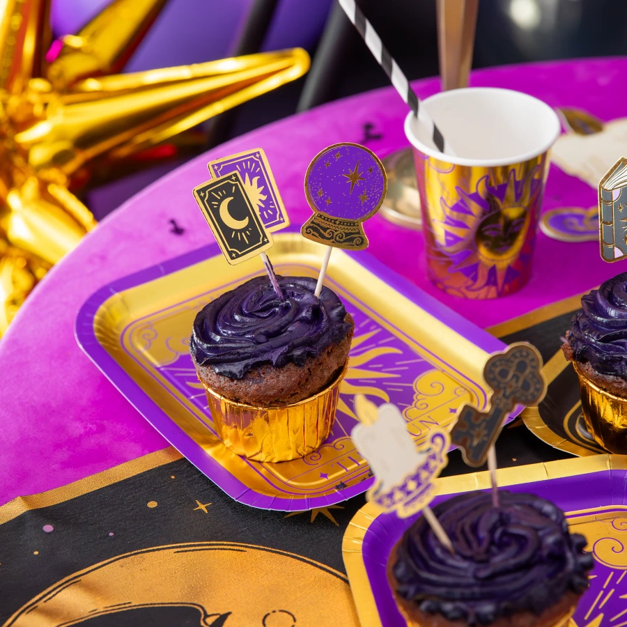 Zestaw 6 dekoracyjnych topperów w klimacie magii i wróżb to idealny sposób, aby ozdobić babeczki, ciasta, przekąski czy inne słodkości. W zestawie znajdują się różne magiczne motywy – kula wróżbiarska, klucz, świeca, karty tarota, złota gwiazda i księga zaklęć – każdy z nich zachwyca złotymi detalami i głębokimi kolorami fioletu oraz czerni.