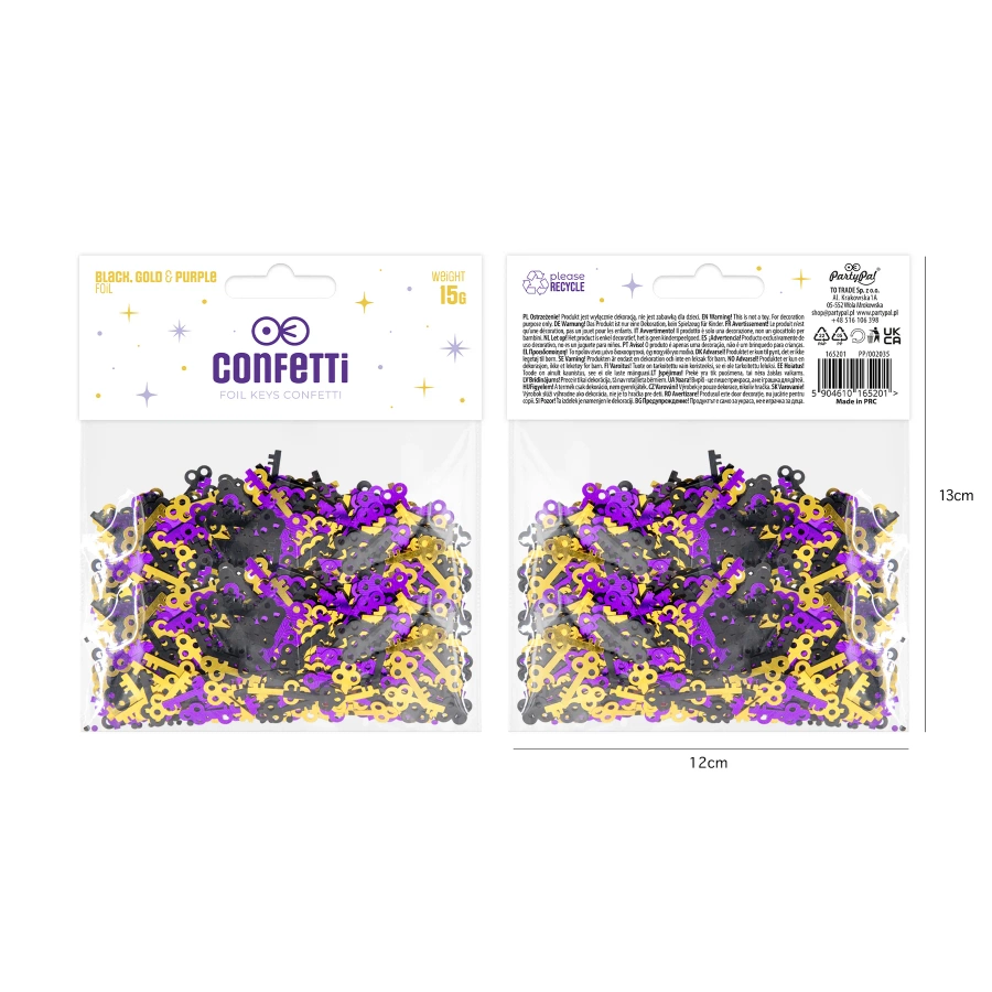- Konfetti w kształcie kluczy, w 3 kolorach: fioletowym, złotym i czarnym.