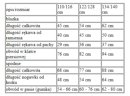 | opis/rozmiar | 110/116 cm | 122/128 cm | 134/140 cm |