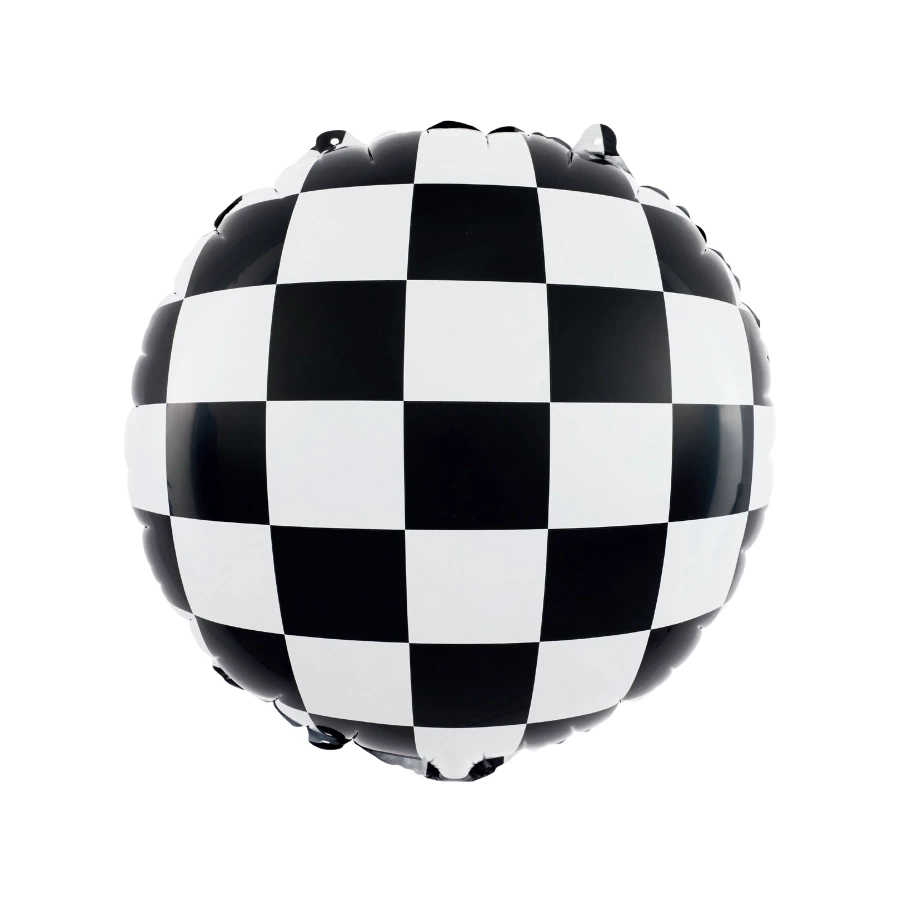 Balon prezentuje motyw flagi w szachownicę – symbol zwycięstwa i sportowej rywalizacji.