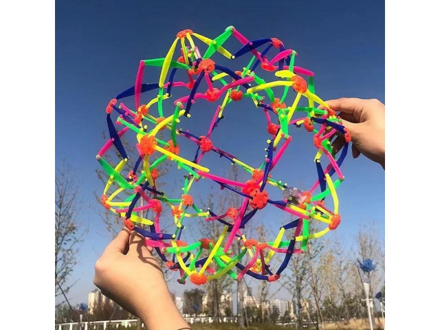 • Kolorowa piłka z tworzywa sztucznego, która dzięki wielu elementom w łatwy sposób składa się i rozkłada.