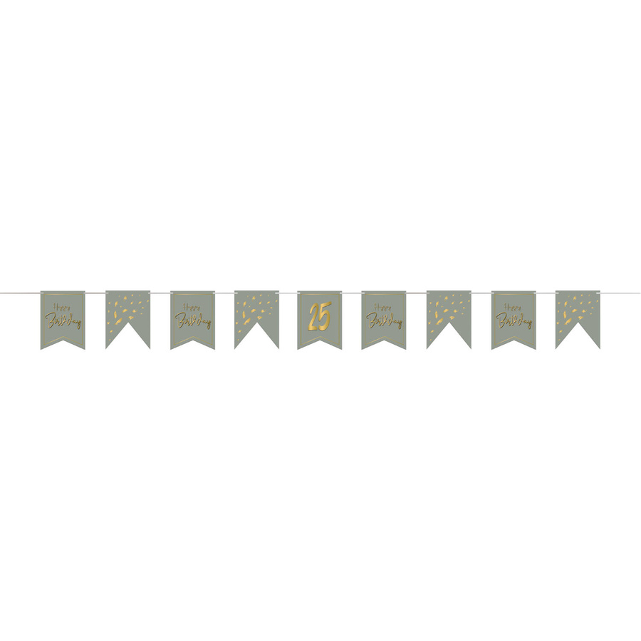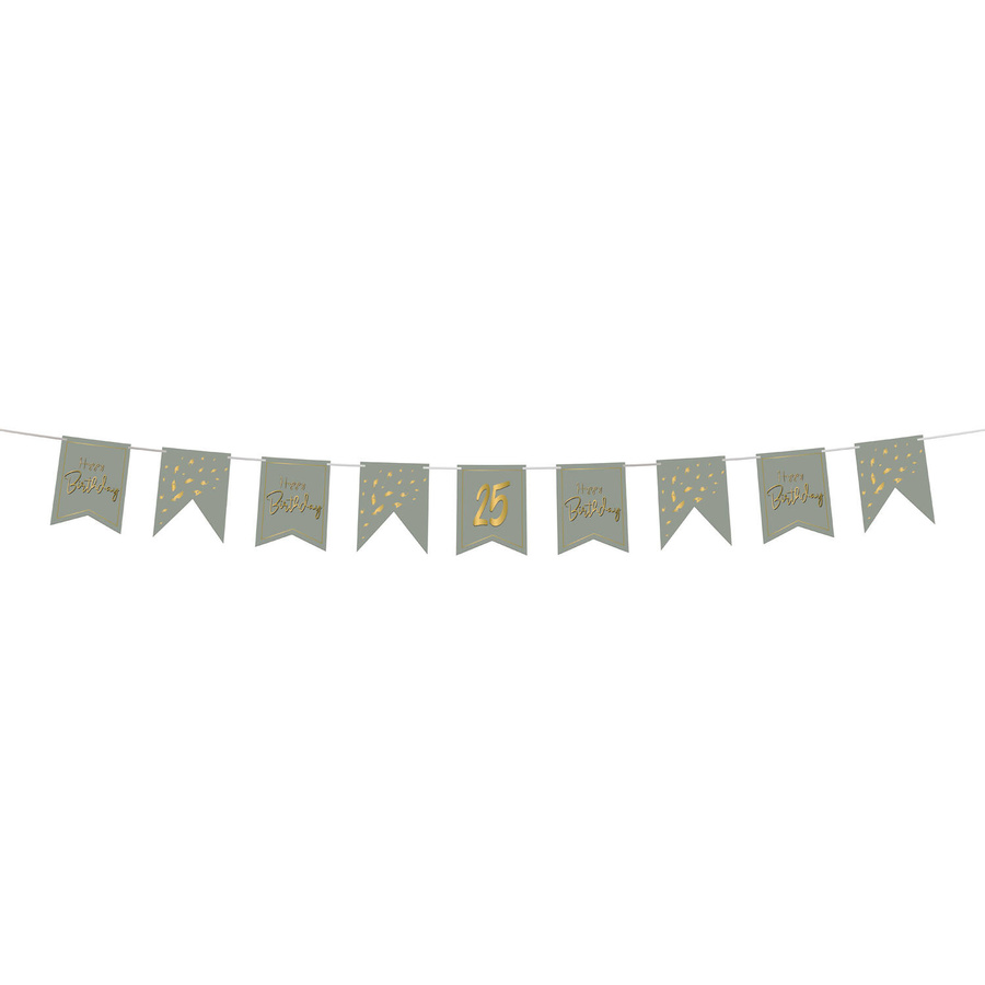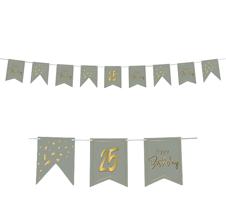 Stwórz wyjątkową, spersonalizowaną dekorację dzięki banerowi urodzinowemu Golden Dawn z naklejkami DIY! Girlanda składa się z 10 chorągiewek w modnym, oliwkowo-szarym kolorze i zestawu złotych naklejek cyfr, dzięki którym samodzielnie spersonalizujesz baner.
