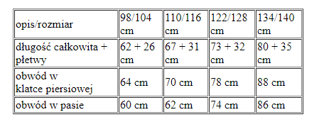 opis/rozmiar | 98/104 cm | 110/116 cm | 122/128 cm | 134/140 cm |
