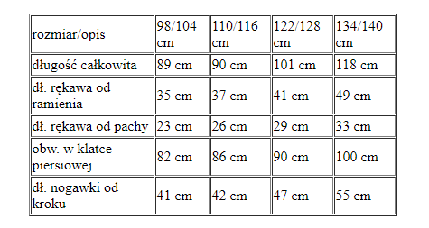 | rozmiar/opis | 98/104 cm | 110/116 cm | 122/128 cm | 134/140 cm |