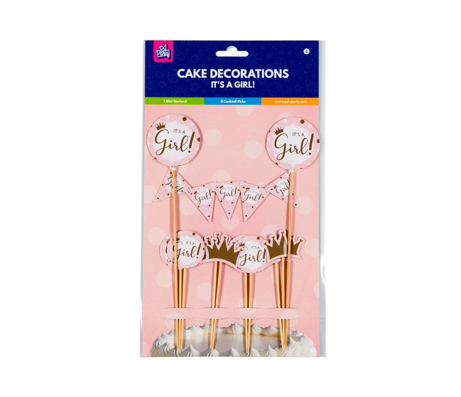 - Różowo złote toppery i pikery z napisem It's a girl to idealna dekoracja tortu i babeczek. Zestaw 9 elementów pozwoli w prosty sposób stworzyć efektowny, tematyczny wystrój stołu.