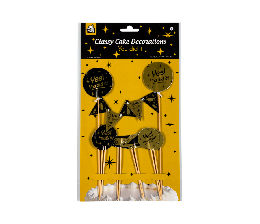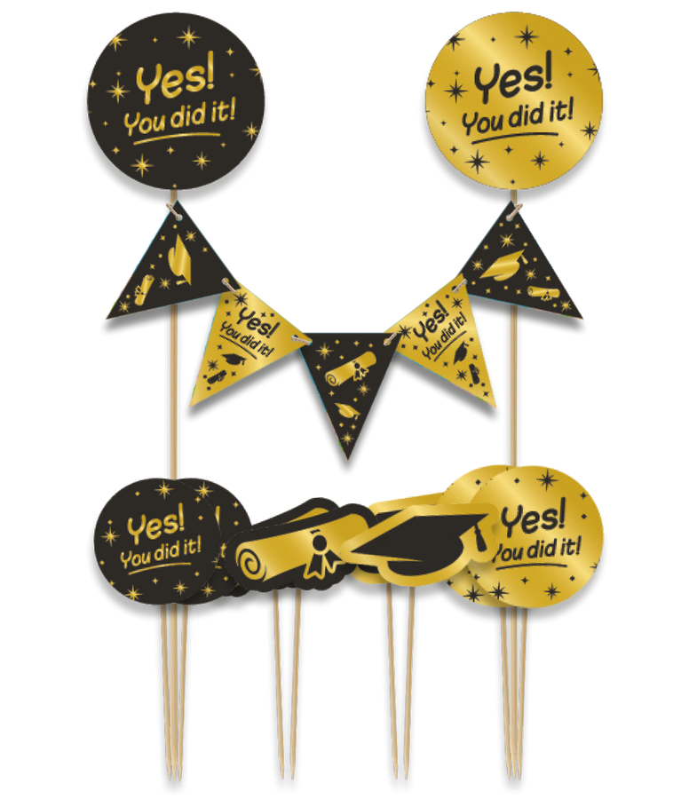 Zestaw topperów dekoracyjnych „Yes, You Did It” to doskonały dodatek na przyjęcia z okazji ukończenia szkoły, zdania egzaminu, awansu czy innego ważnego osiągnięcia. Stylowe i nowoczesne wzory dodadzą każdemu deserowi odrobiny blasku i pozytywnej energii.