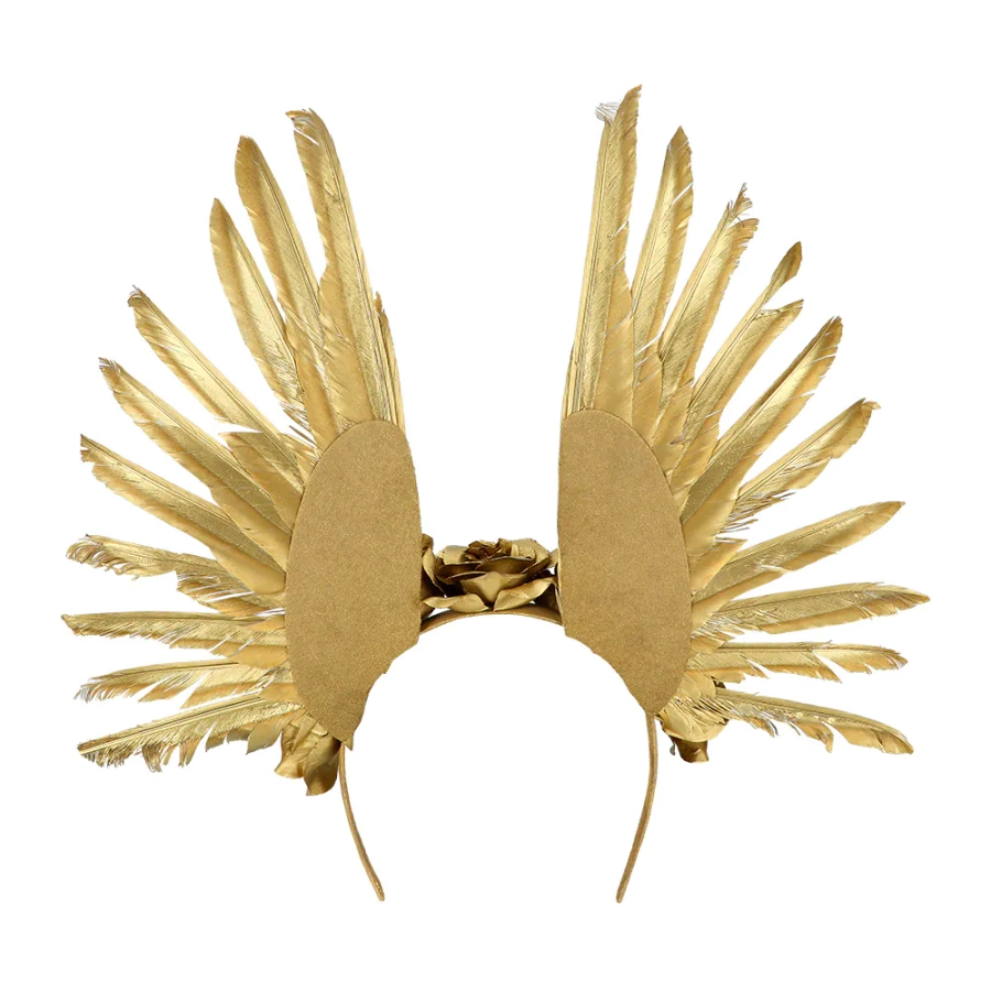 - Zjawiskowa opaska korona Tiara Stella w kolorze złotym. Bogato zdobiona kwiatami i piórami tworzącymi efekt skrzydeł. Idealna na festiwal, sesję zdjęciową, karnawał lub wyjątkowe wydarzenia.