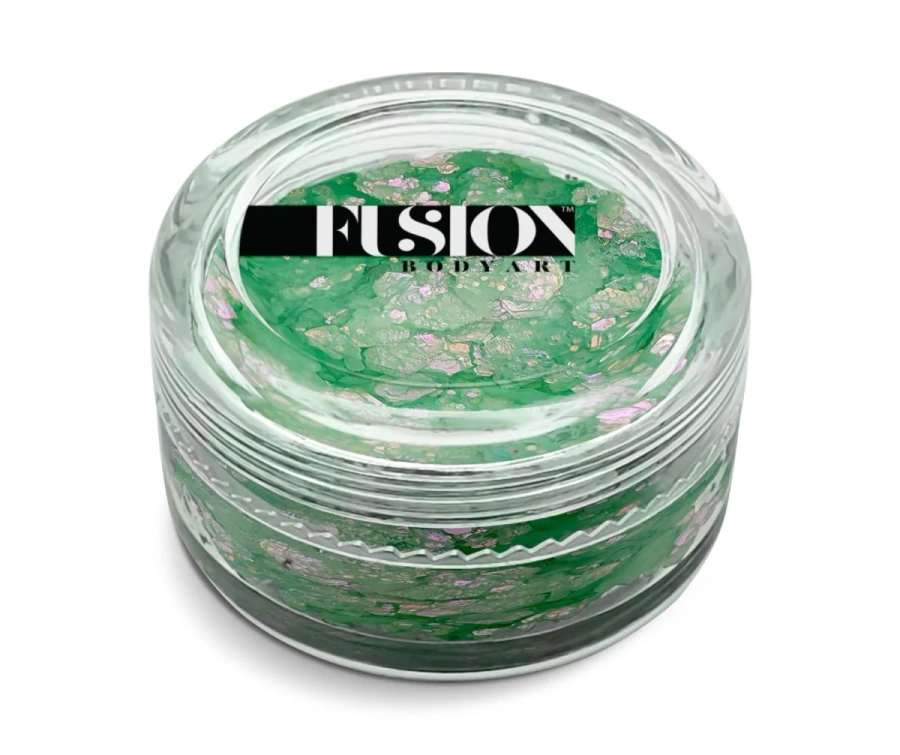 Brokat Fairy Sprinkles to przede wszystkim mieszanka różnych rozmiarów i kształtów nieprzezroczystego brokatu. Kremy Fusion Glitter Cream świetnie nadają się do dodawania brokatu na skórę lub farbę do twarzy. Są miękkie i elastyczne, a ich woskowa baza przywiera do powierzchni. Te błyszczące kremy można nakładać na skórę lub suchą farbę do twarzy za pomocą silikonowego aplikatora lub plastikowej szpatułki.