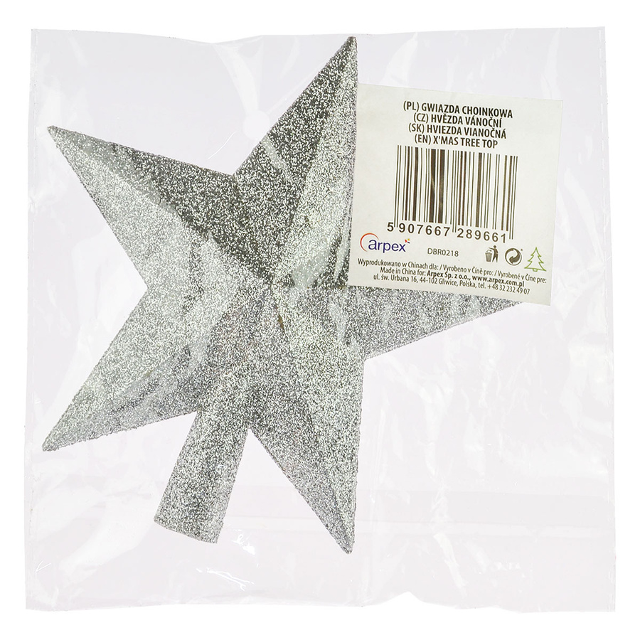 - Srebrna gwiazdka brokatowa , klasyczna ozdoba na choinkę.
